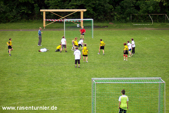 Das Spiel der E-Jugend (bis 10 Jahre) gewinnt Kahla mit 9:4 gegen Apolda. Der HSV Apolda (in weiß) im Angriff.