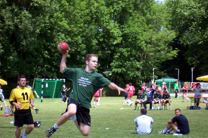 Hier wirft ein Spieler vom VfB Fortuna Biesdorf ein Tor gegen Anhalt Bernburg. Biesdorf gewinnt mit 8:4